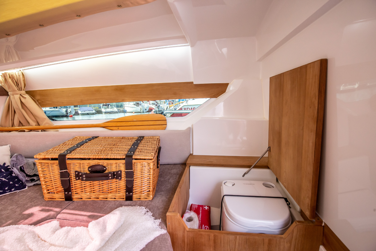 In der Kabine finden Sie einen großen Schlafplatz, der für mindestens zwei Erwachsene Personen ausreichend Platz bietet. Ebenso befindet sich dort ein Toilettenbereich. Die Coaster DC7 wurde entwickelt, um Ihnen und Ihrer Familie die besten Bedingungen auf dem Wasser zu bieten.